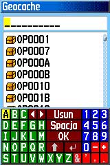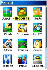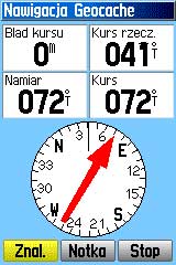 Wciskamy guzik Find i przechodzimy do menu wyszukiwania, wybieramy Geocache. Na tej liście punktów wyświetlone będą jedynie waypointy dotyczące skarbów. Wybieramy interesującą nas skrzynkę i potwierdzamy Enterem. Następnie na ekranie ze szczegółami tego waypointa wybieramy przycisk graficzny IdźDo i potwierdzamy Enterem. Zostaniemy przeniesieni na ekran Kompasu i rozpoczynamy nawigację do skarbu.