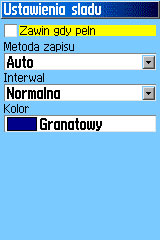 Zaznaczenie pierwszej z opcji "Zawiń gdy pełen" umożliwia (w momencie zapełnienia pamięci odbiornika) nadpisywanie najstarszych punktów śladu tymi najnowszymi. Gdy opcja ta nie jest zaznaczona (jak powyżej) w momencie zapełnienia pamięci odbiornika rejestracja śladu zostanie zatrzymana.